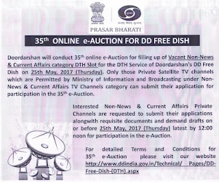 Prasar Bharati will conduct 35th Online e-Auction for DD Free Dish on 25 May 2017, it is for vacant non-news and currently affairs category in DTH Slot for doordarshan dd free dish .more details below and also in dd india website